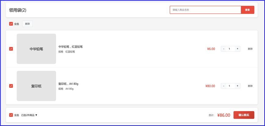 c) 我的领用袋,确定商品名称、规格、价格、数量、点击确认购买进行订单确认